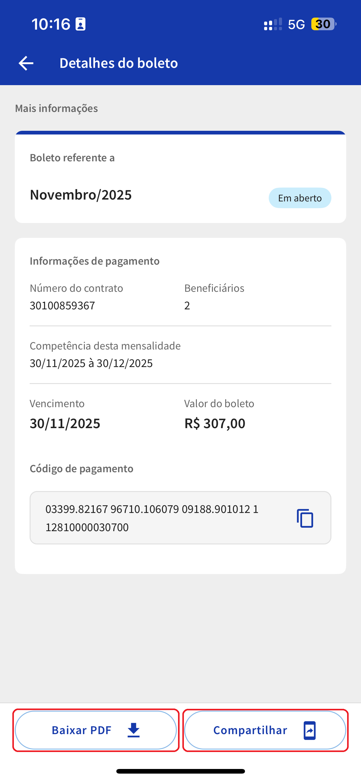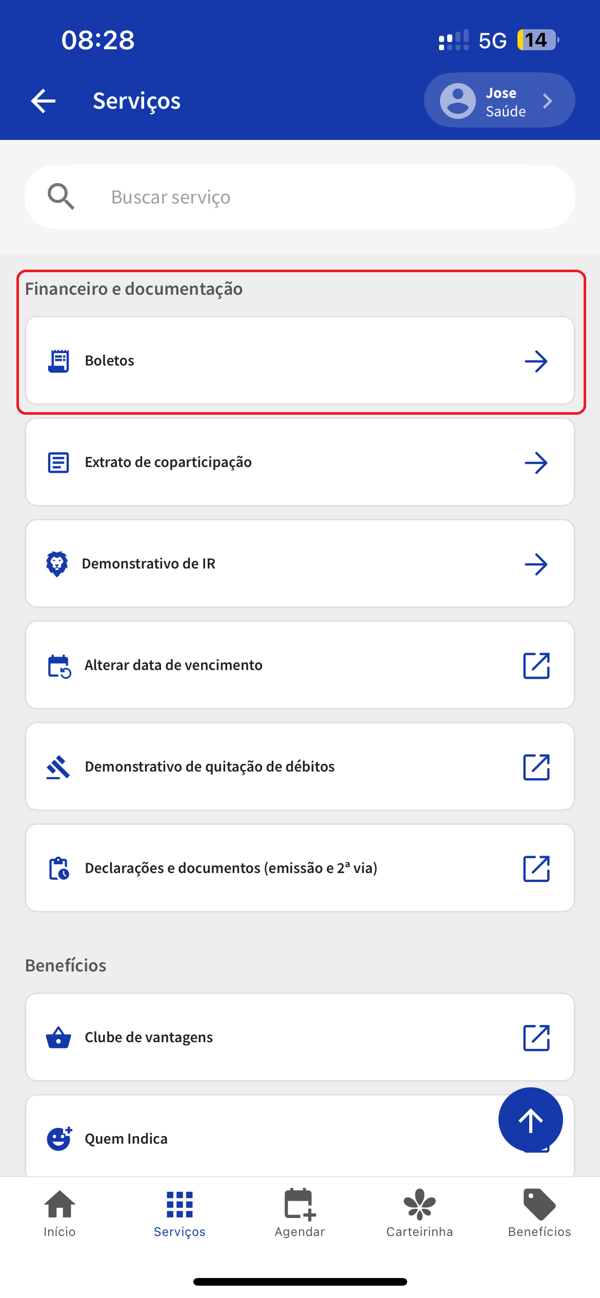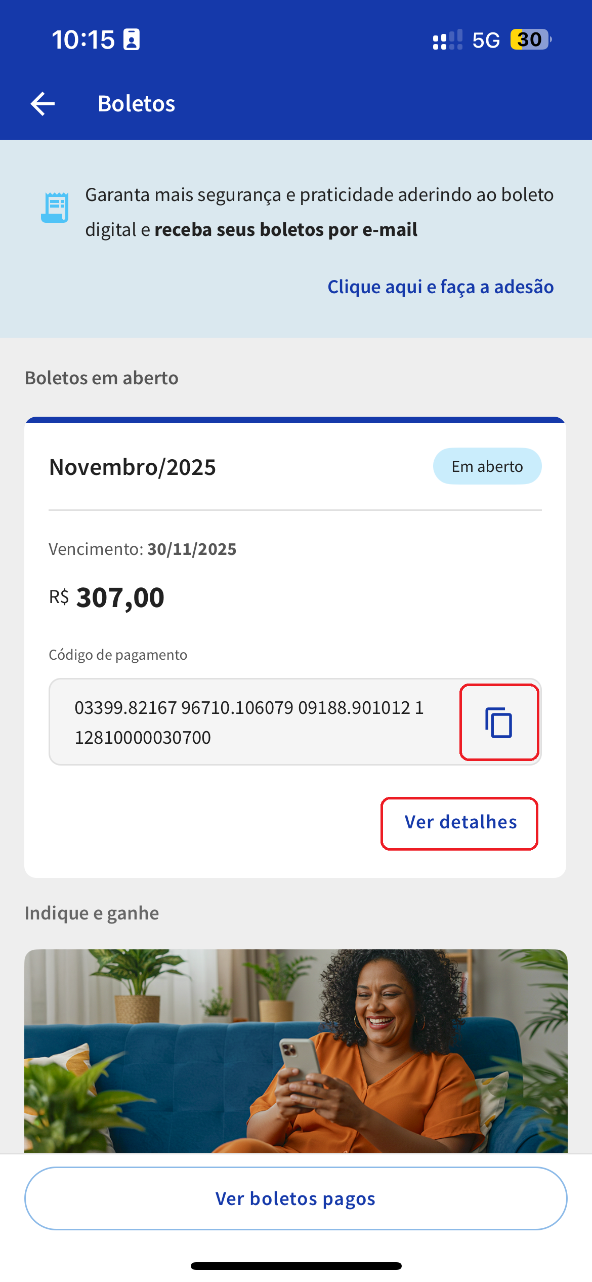 Caso existam boletos disponíveis para pagamento, eles aparecerão na seção “Boletos em aberto”.